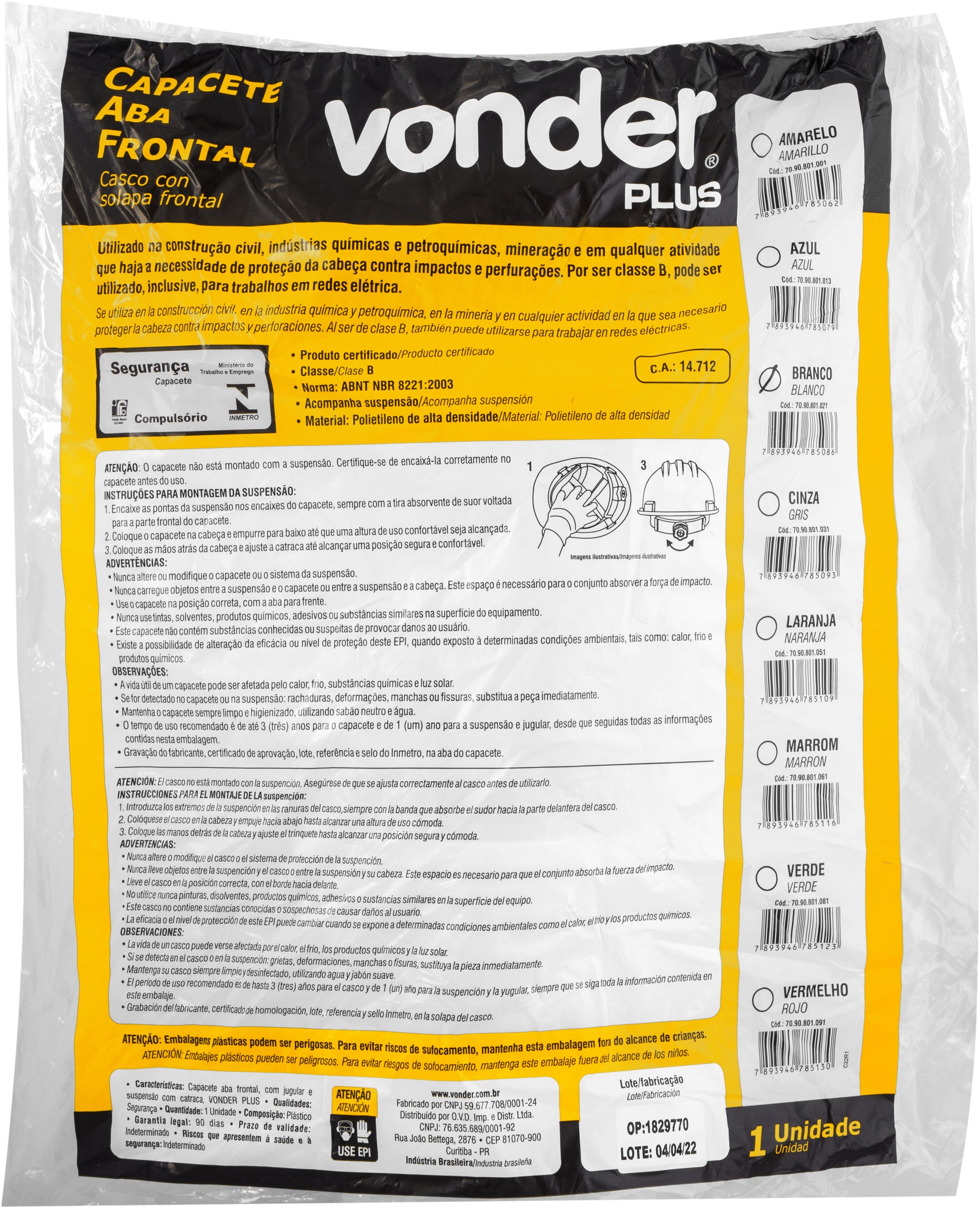 Capacete aba frontal, branco, com jugular e suspensão com catraca, VONDER PLUS - CA 14712