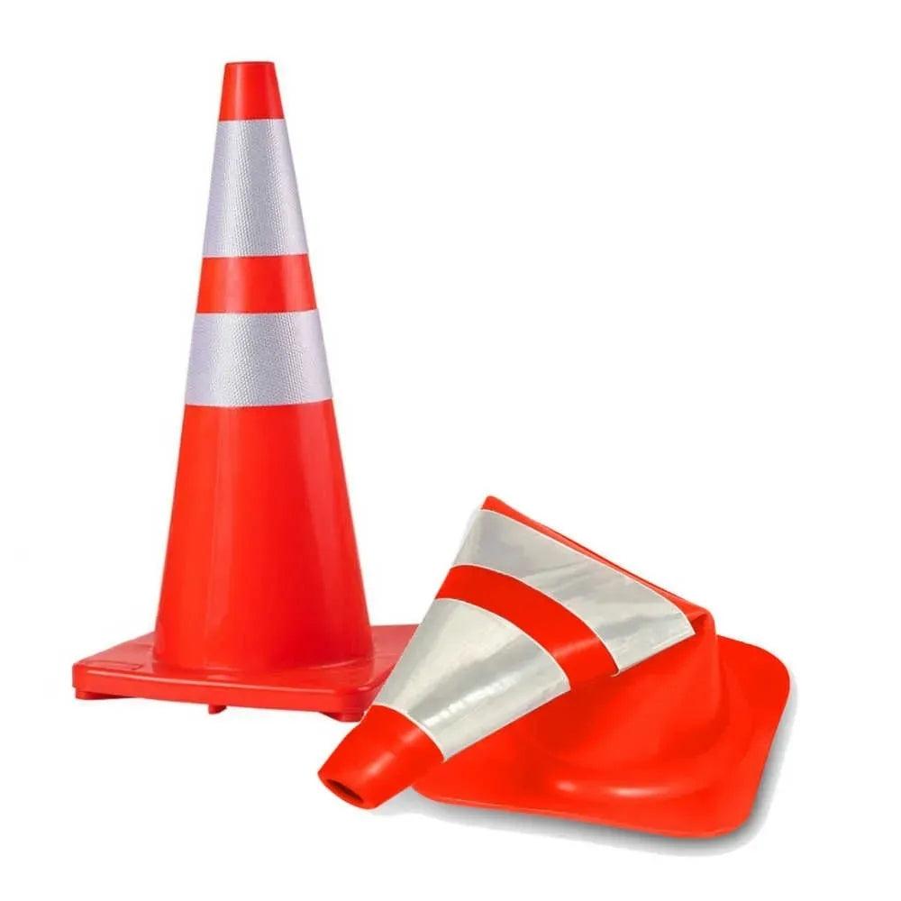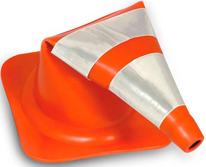 Injetado em PVC na cor laranja com duas faixas refletivas na cor branca com retrorrefletância de 100 candelas, soldadas eletronicamente no cone. Medida da base do cone de sinalização: 40 cm x 40 cm.