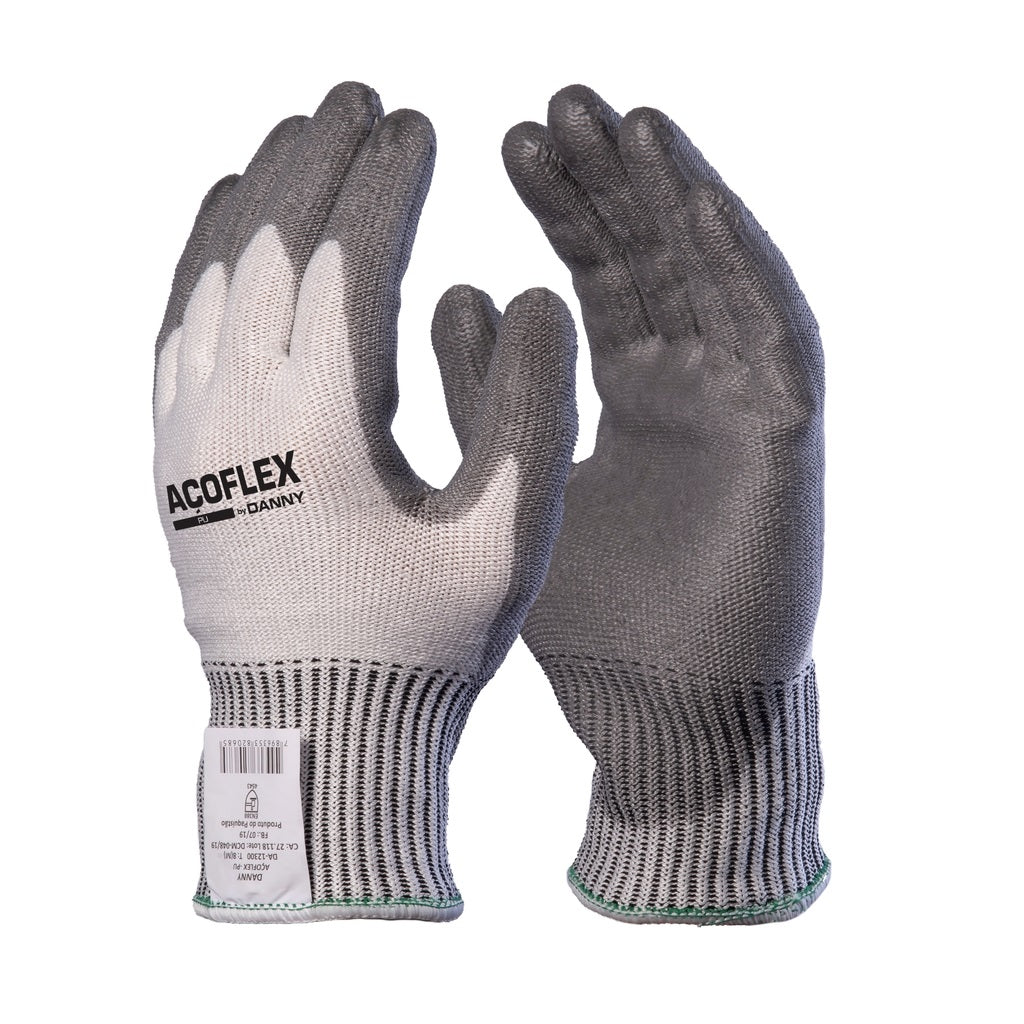 A luva Açoflex com PU é confeccionada em polietileno de alta densidade e fio de aço, banhado com poliuretano na palma e nos dedos. É flexível e tem baixa espessura, oferecendo tato e conforto para atividades que exijam precisão e alta resistência a cortes. O polietileno é produzido a partir de um processo de tecelagem e sua fibra chega a ser 15 vezes mais resistente que o aço.