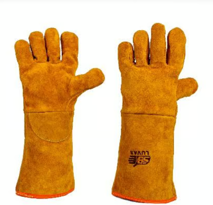 Luva de raspa forrada ignofugada com grafatex e feltro, punho 20 cm, com protetor de artéria, costurada em fio de aramida