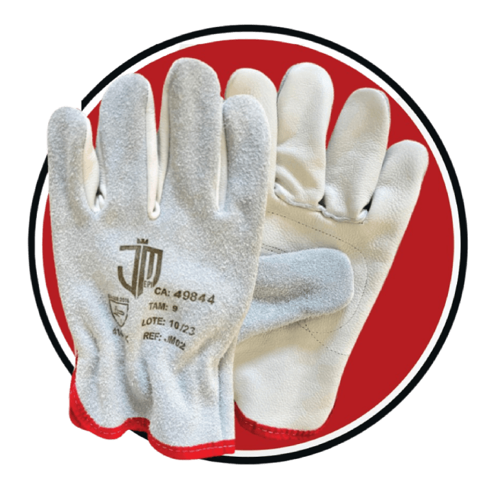 Luva de segurança confeccionada em couro tipo vaqueta, reforço externo no polegar e entre os dedos, elástico transversal no dorso e viés de acabamento.