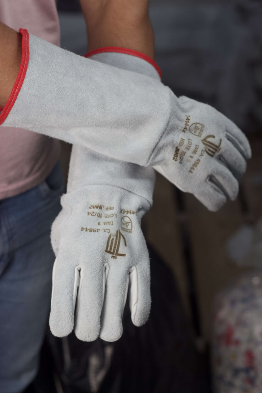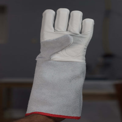 Luva de segurança confeccionada em couro tipo vaqueta, reforço externo no polegar e entre os dedos, elástico transversal no dorso e viés de acabamento.