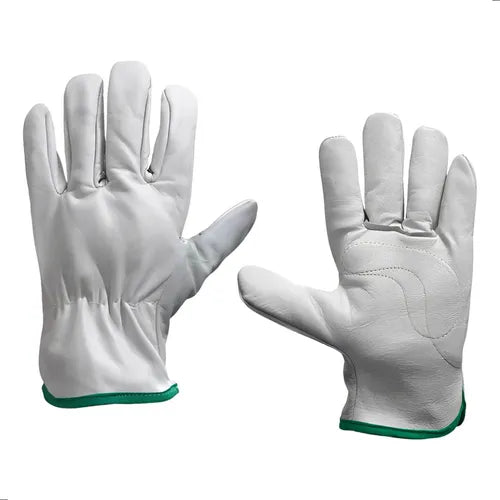 Luva de segurança confeccionada em vaqueta, modelo cinco dedos, reforço interno em raspa na palma e elástico embutido no dorso na altura do punho.