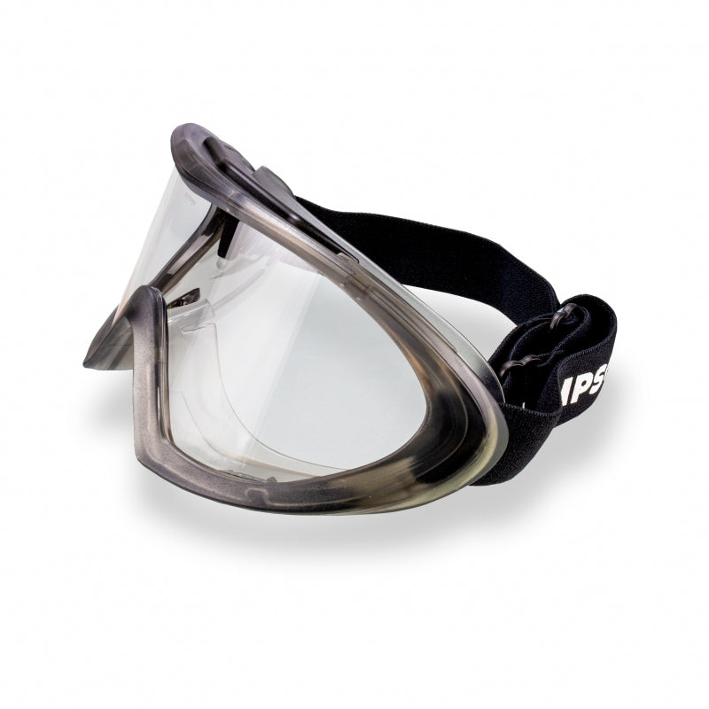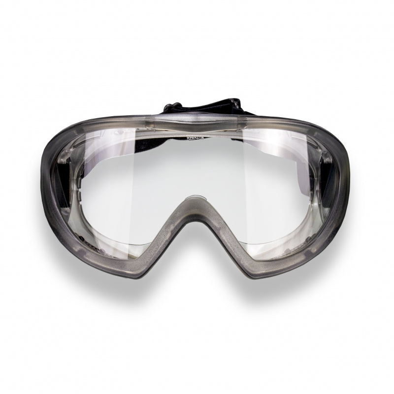 Óculos de proteção, modelo ampla-visão, com visor confeccionado em policarbonato incolor, constituídos de armação confeccionada em uma única peça de PVC flexível cinza transparente, sistema de ventilação indireta composto de 122 orifícios localizados na parte superior e 40 orifícios de cada lado na parte inferior recobertos por um plástico preto rígido, tirante elástico preto em tecido com duas presilhas que permite o ajuste de tamanho à face do usuário, encaixado na parte lateral dos óculos através de pinos rígidos de PVC localizados na parte interna da armação, modelo cobre toda a região dos olhos do usuário.