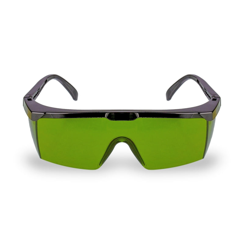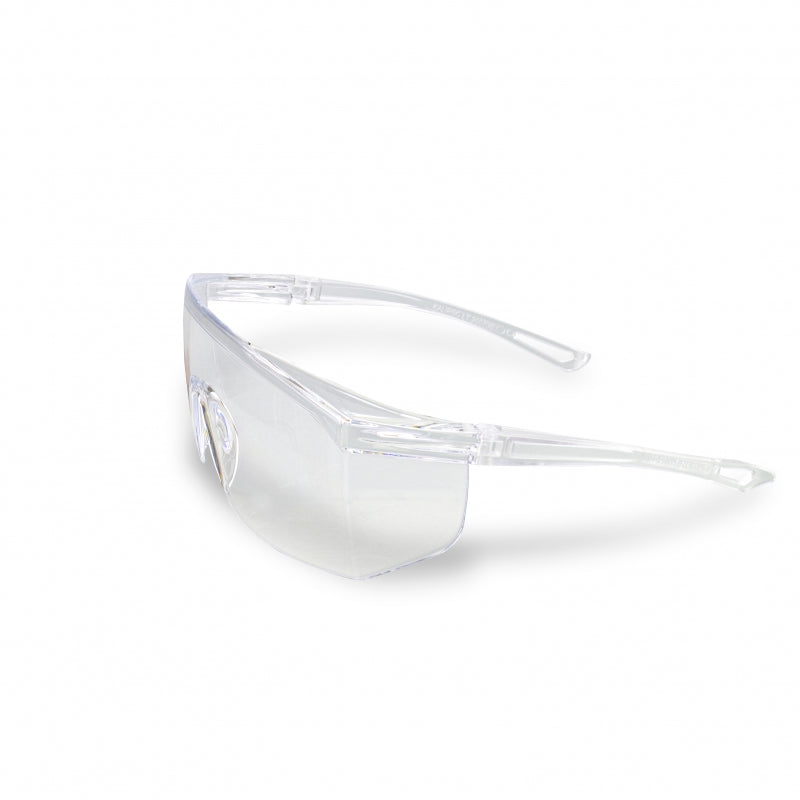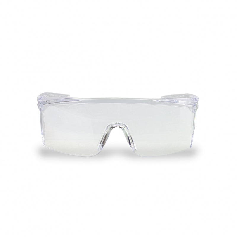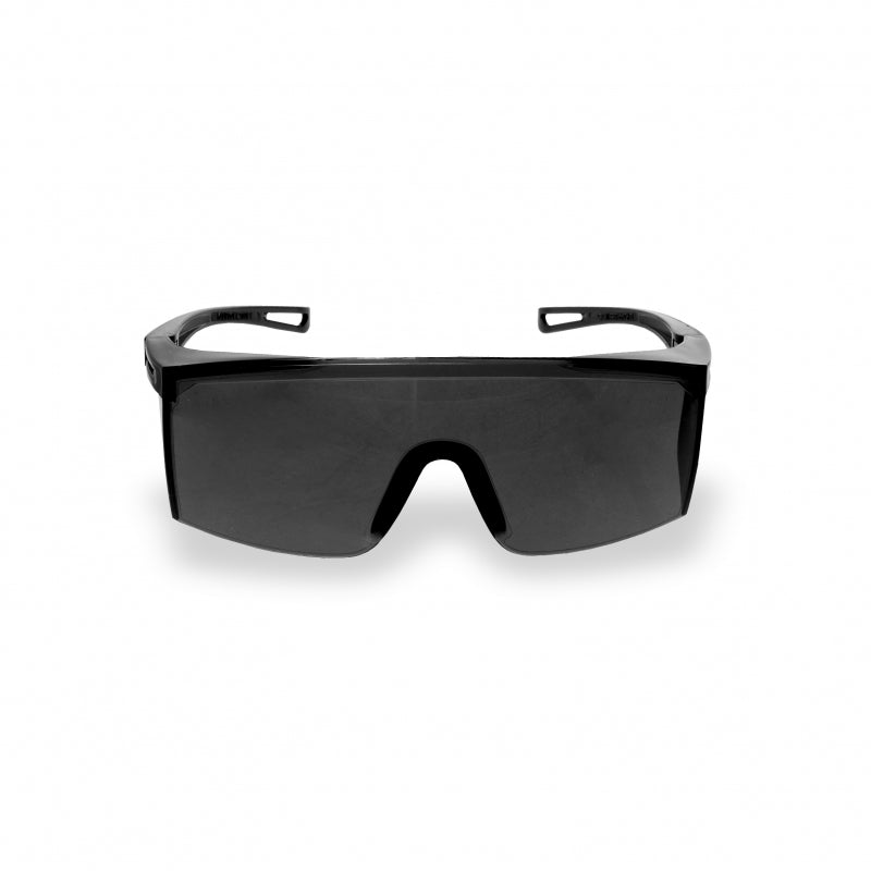 Óculos de proteção, visor confeccionados em policarbonato com proteção lateral e meia proteção na borda superior injetada na mesma peça. Hastes confeccionadas do mesmo material do visor e articuladas nas extremidades do visor por meio de parafuso metálico.
