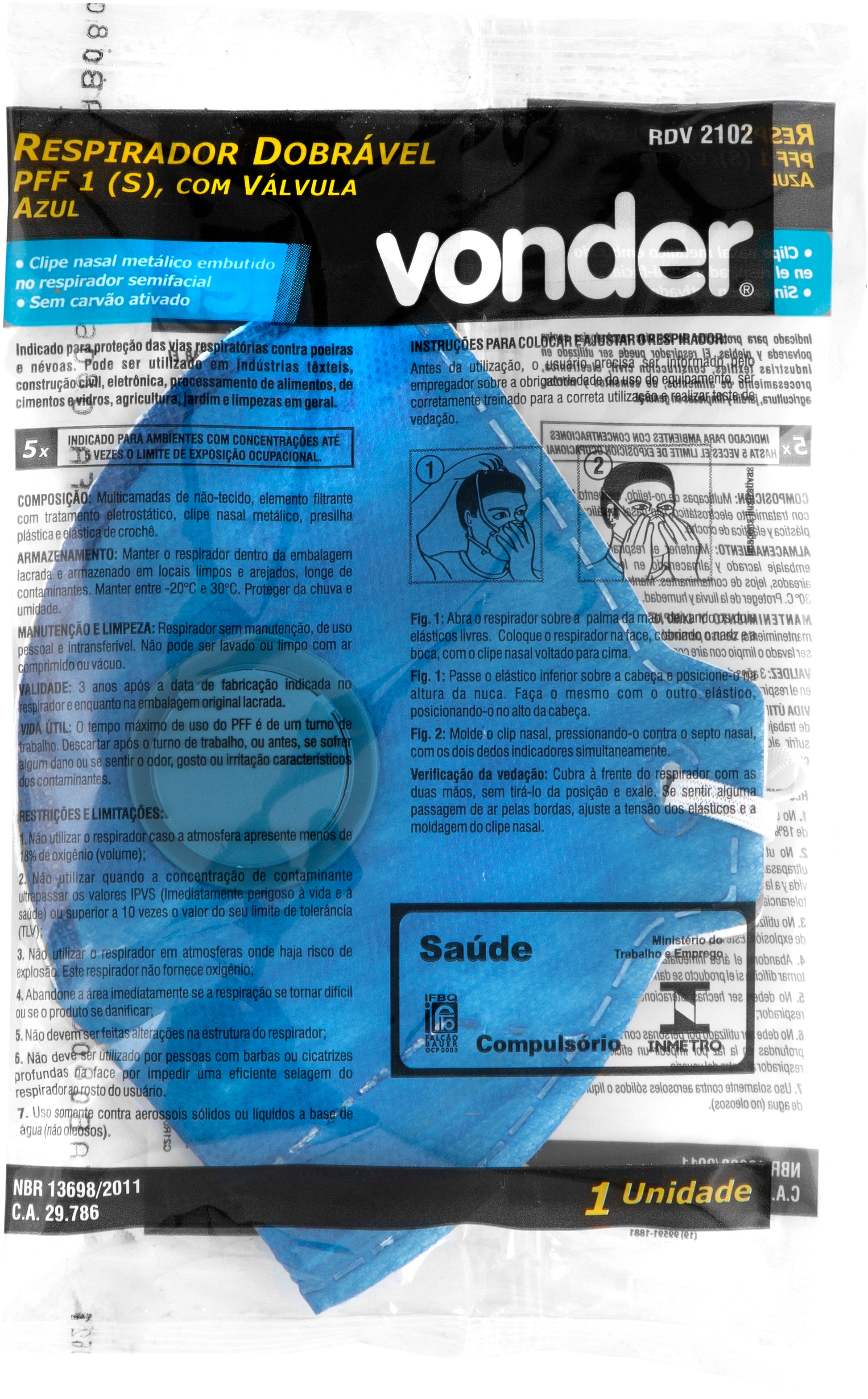 Respirador dobrável, semifacial, PFF1, RDV 2102, azul, VONDER - C.A 29786